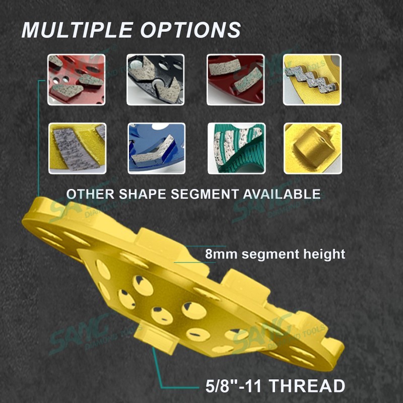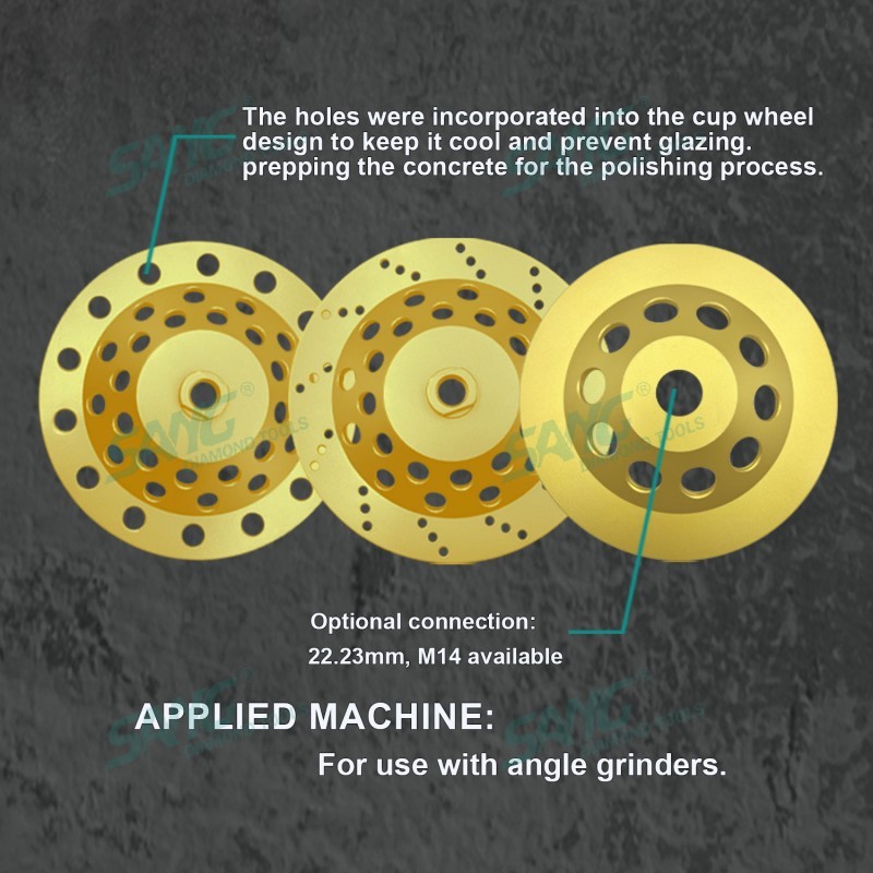 se utilizează pentru mașina de măcinat portabilă și echipamente speciale de recălare. utilizare pentru șanțare, teșire și șlefuire și muchie de beton & amp; suprafaţă. marimea granulatului: 36 #, 46 #, 60 #, 80 #, 100 #, 120 #, 200 #, personalizate. există conexiune universală de la φ15 (22,23 mm / m14)
