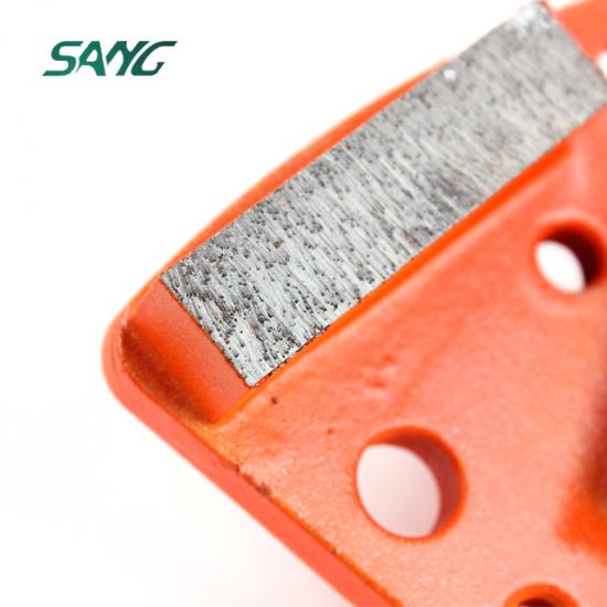 Forma „trapezoidală” se referă la forma specifică a segmentului care permite șlefuirea și lustruirea eficientă a pardoselilor din beton, în special în colțuri și margini. Designul „bară dublă” înseamnă de obicei că există două rânduri de segmente de diamant în fiecare unealtă în formă de trapez, oferind mai multă putere de șlefuire și o durată de viață mai lungă în comparație cu segmentele cu o singură bară.